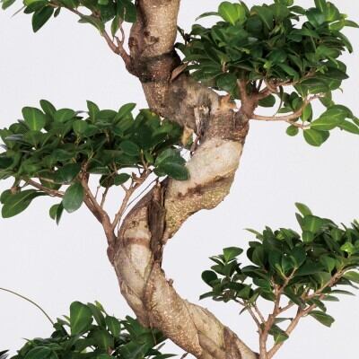 くねくねと曲がった幹と、丸く艶やかな葉が魅力の観葉植物です。