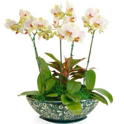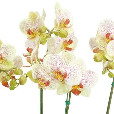 優しいクリームイエローに淡く赤い模様が入った胡蝶蘭。