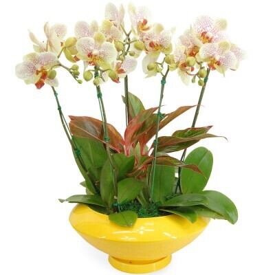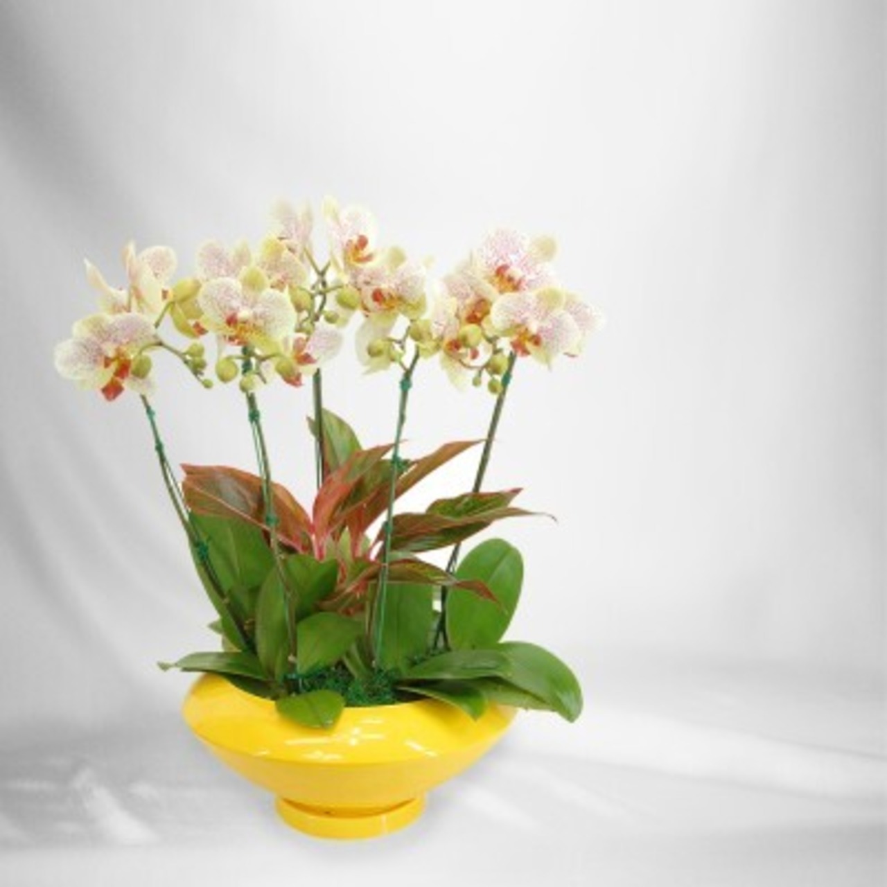 優しいクリームイエローに淡く赤い模様が入った胡蝶蘭。